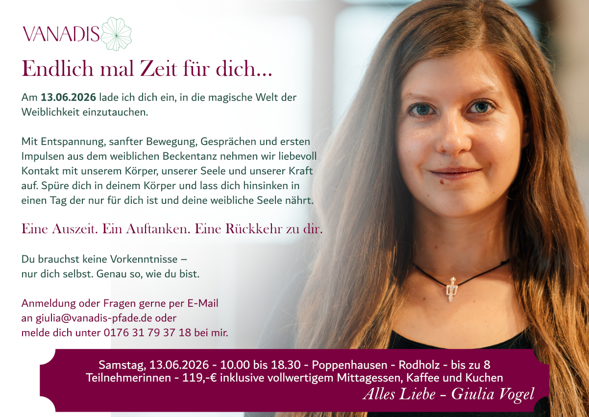 Ich biete Frauenkreise, individuelle Beratungen und Wochenendseminare an, die dazu einladen, die weibliche Schöpferinnenkraft zu erwecken und die Verbindung zu Körper und Natur zu stärken. Diese Angebote sind ideal für Frauen, die sich selbst voll erfahren, und ihre innere Kraft entfalten möchten.